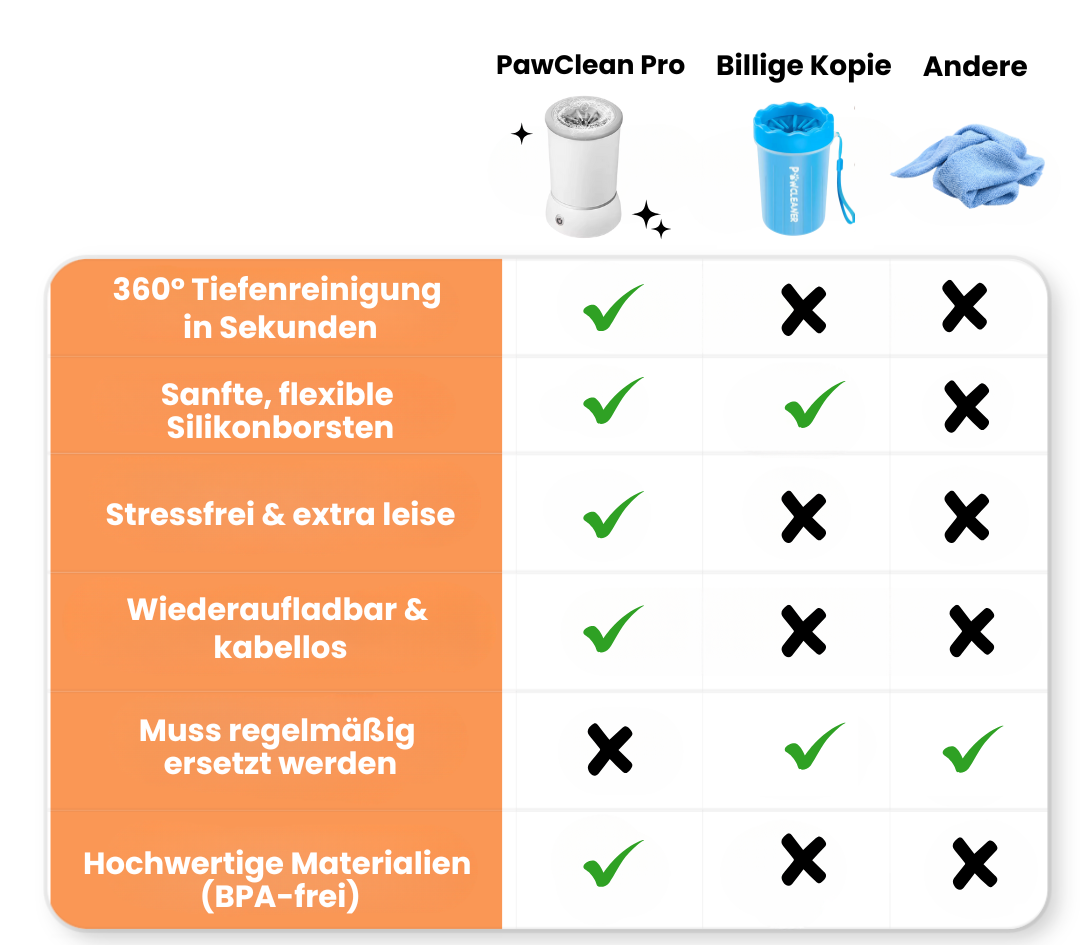 Mit über 37.000 glücklichen Haustierbesitzern sind wir überzeugt: PawClean Pro™ sorgt für saubere Pfoten in Sekunden, sanfte 360°-Reinigung und stressarme Anwendung – ganz ohne Aufwand und Risiko. Schon nach dem ersten Einsatz siehst du den Unterschied: weniger Schmutz zuhause, geschützte Ballen und ein entspannter Hund. Und sollte dir das Produkt nicht zusagen, kannst du es innerhalb von 30 Tagen unkompliziert und unbeschädigt zurücksenden.