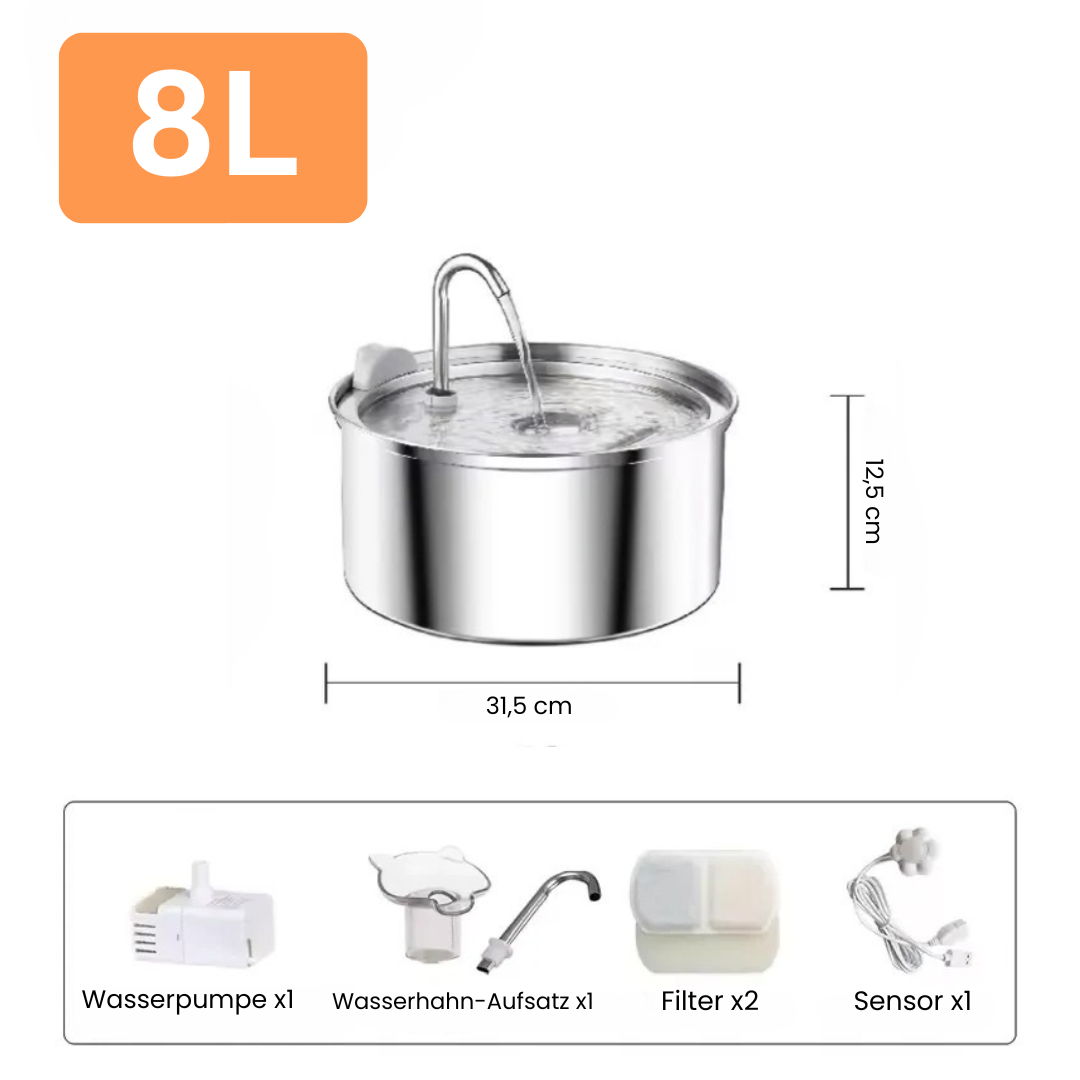 Der Brunnen besteht aus hochwertigem 304 Edelstahl, an dem sich kaum Bakterien festsetzen können.