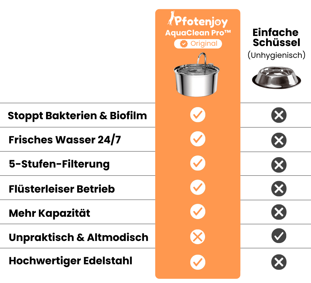 Empfohlen von Tierärzten und Haustierexperten. Der AquaClean Pro™ versorgt dein Tier mit frischem, keimarmem Wasser, arbeitet ultra leise und ist dank hochwertigem Edelstahl besonders hygienisch. Unser Brunnen steht für gesunde Wasserversorgung, stressfreie Nutzung und geprüfte Materialqualität.